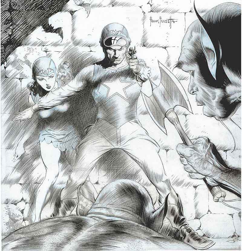 This copy is interesting because not only does it reveal the ink in a state of brand new freshness, but it still has some of the original underlying pencils before they were subsequently erased. In this copy the pencil adds another dimension to the original. The image, of course, is sensational, and the original cover sold for a record price. Back in 1995, Alex Acevedo of the ALEXANDER GALLERY in NYC offered Frank the ACE paperback oil of TARZAN AND THE JEWELS OF OPAR in trade for this FAMOUS FUNNIES cover. Frank asked me what I thought about the offer. I told him it was a fair offer but that there was magic in all that crosshatching. I told him I would never do that deal. Frank turned the deal down. It was a good decision.